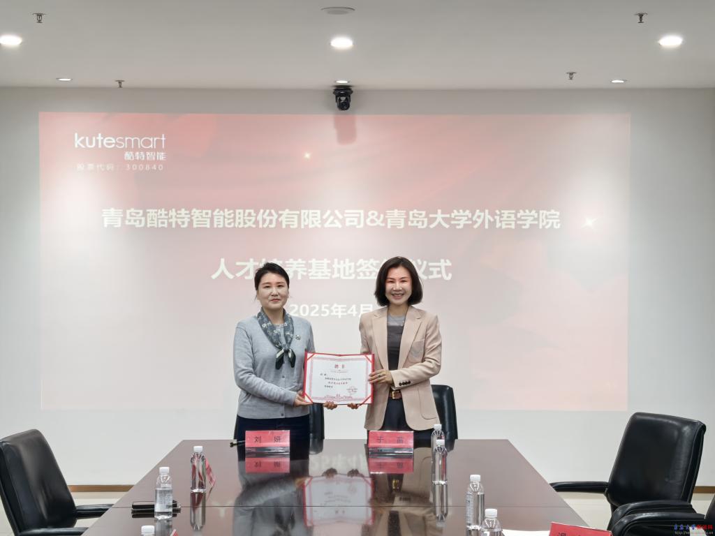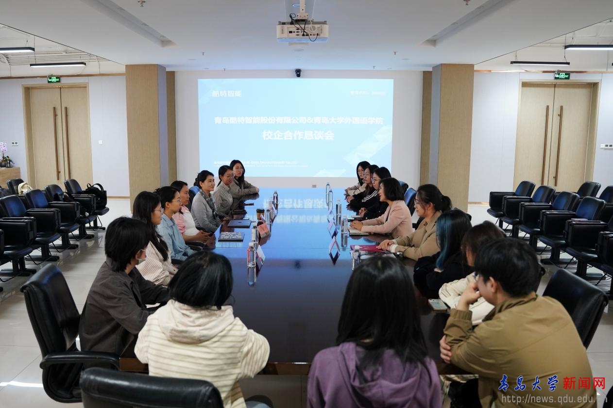 在校企合作交流会上,外语学院与青岛酷特智能公司聚焦校企合作的多层架构与多领域协同发展展开了深入讨论。青岛酷特智能公司负责人详细介绍了公司的核心理念、企业文化及以及发展前景。于苗介绍了外语学院的各专业概况、生源特色及创新实验班的设立情况。双方代表就毕业生精准就业对接、企业实习基地共建等话题达成了初步合作意向,并签订“人才培养基地”合约书,于苗代表外语学院向刘妍颁发校外就业导师聘书。