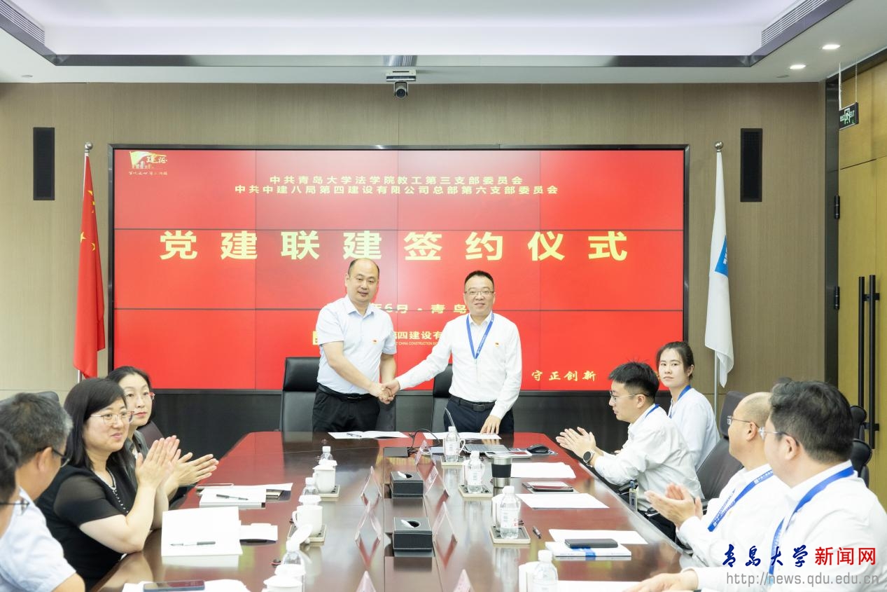 法学院教工第三党支部书记周峨春与中建八局物资管理部经理、总部第六党支部书记金光辉签订《党建联建协议》。