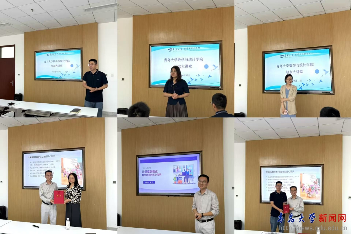 新闻网讯 6月12日,创新创业学院与数学与统计学院联合举办的“正奇创新创业大讲堂”第66期暨数学与统计学院校友大讲堂第2期在文化艺术中心C座302顺利举办。数学与统计学院2006级优秀校友、青岛捷径文化培训学校创始人曲艺应邀作题为“从课堂到创业——数学教育的匠心传承”的讲座。创新创业学院常务副院长、教务处副处长席岩,数学与统计学院院长刘奎、院党委副书记魏小平及相关师生代表参加了此次活动。