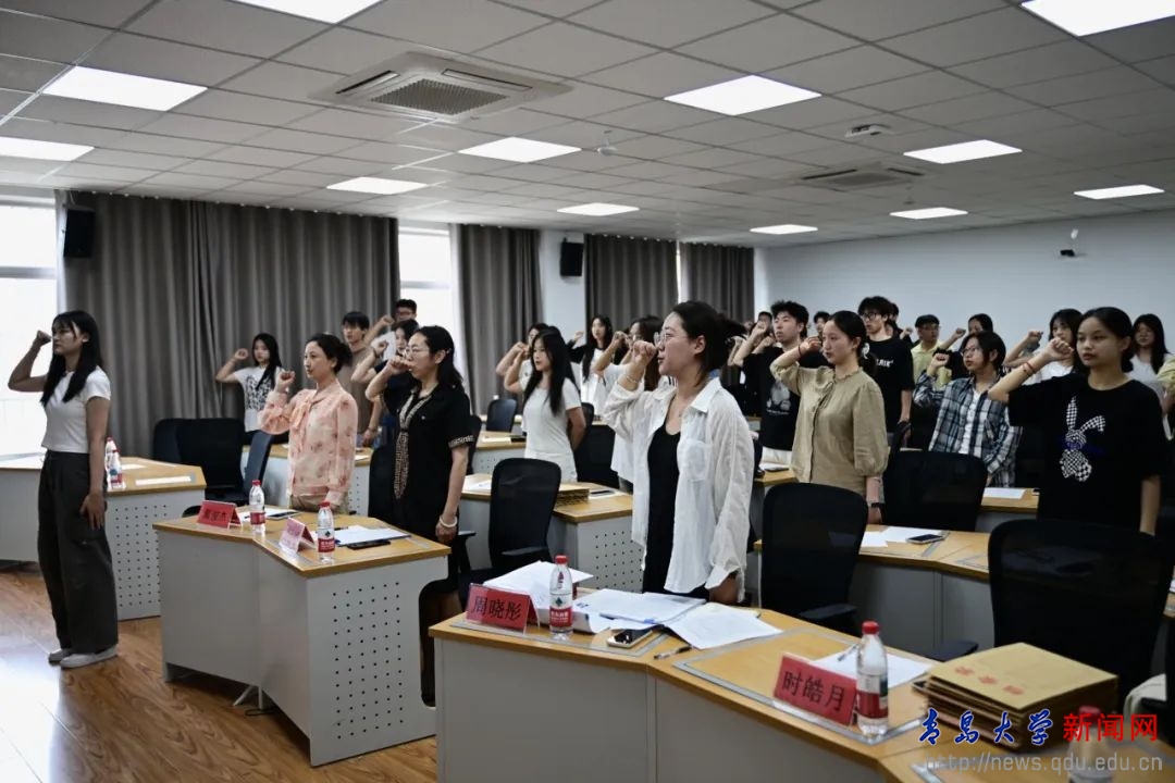 于文洁和戴俊杰为党员代表佩戴党徽。一枚枚党徽不仅是身份的象征,更是责任与担当的标志,激励着青年党员们以更高标准要求自己,让党旗在奋斗一线高高飘扬。