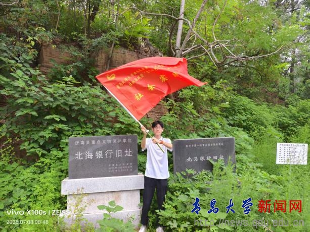 7月8日下午,实践团来到了距沂蒙红色金融纪念馆8公里的大梨峪村。沿着蜿蜒的山路,队员们来到“北海银行旧址”石碑前。这方石碑在微风蝉鸣中静静地伫立,默默标注着这片土地的红色记忆。