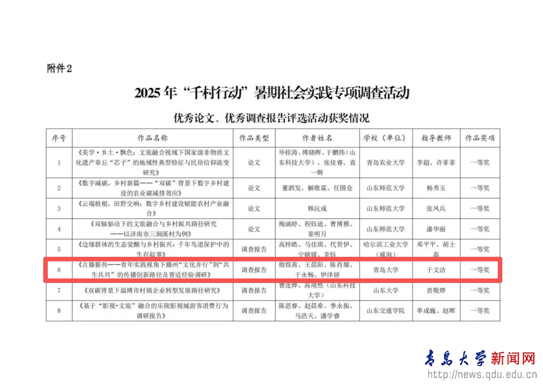 2025年“千村行动”暑期社会实践专项调查活动吸引了省内外53所高校近1000支实践队伍、2000余名师生参与,产生了广泛的社会影响。经济学院学生作品《古滕薪传一一青年实践视角下滕州“文化并行”到“共生共兴”的传播创新路径及普适经验调研》荣获优秀论文和优秀调查报告一等奖、金年金字招牌诚信至上荣获优秀组织单位、经济学院党委副书记于文洁荣获优秀指导教师、殷煜茜、王晨阳荣获社会调查先进个人。