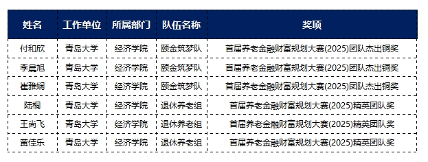 经济学院对本次养老金融财富规划大赛高度重视、统筹协调。备赛期间,学院选调养老金融、财富管理等领域优秀师资,以“线上一对一辅导”形式,围绕养老需求分析、方案设计等核心模块指导选手,并从专业训练、资源对接等方面提供全方位保障。本次获奖是学院养老金融领域实践教学成果的体现,也彰显了学生专业知识与社会养老需求结合的创新能力。未来,学院将以大赛为契机,深化与养老及金融机构的校企合作,推动“竞赛成果转化-课程优化-产业实践”良性循环,为养老财富管理行业及区域养老服务品牌建设输送高素质创新人才。