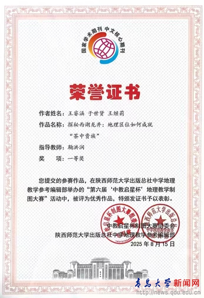 8月,第六届“中教启星杯”地理教学制图大赛落下帷幕。学院2022级地理科学(师范类)本科生王睿涵、于世贤,以及2024级学科教学(地理)专业研究生王继莉三位同学表现优异,喜获一等奖,鞠洪润老师荣获“优秀指导教师奖”。