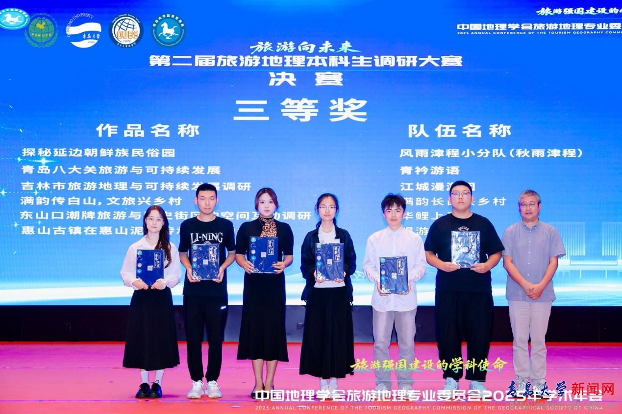 9月,在青岛举办的第二届旅游地理本科生调研大赛中,学院学子再次崭露头角。2024级地理科学(师范类)本科生徐文洁、赵嘉祥、董子琴、钟子恒、张兆震等,在鞠洪润老师的指导下,凭借作品《独库公路旅游发展:流量激增下的效益与承载困境》,从全国众多高校团队中脱颖而出,荣获二等奖。同时,2024级牟芮、李昱鑫、李兆龙、傅琳、王悦情5位本科生在徐雪老师指导下,以作品《青岛八大关的旅游与可持续发展》喜获三等奖。