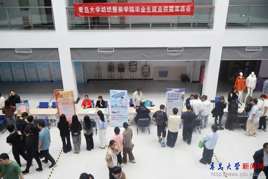 新闻网讯 10月11日下午,纺织服装学院2026届毕业生就业供需双选会(第一场)在新纺织大楼B座一层中庭举办。本次双选会共吸引西默会展会务集团、迪尚集团、三阳集团、威海凯华、威海思来、广州希音、烟台明远、即发集团等17家知名企业参与,涵盖纺织工程、服装设计与工程、轻化工程、服饰与服装设计等多个专业领域,为不同专业背景的毕业生创造了丰富的就业选择空间。纺织服装学院党委书记李凌云、院长许长海参加本次就业供需双选会,并在现场与企业代表交流。
