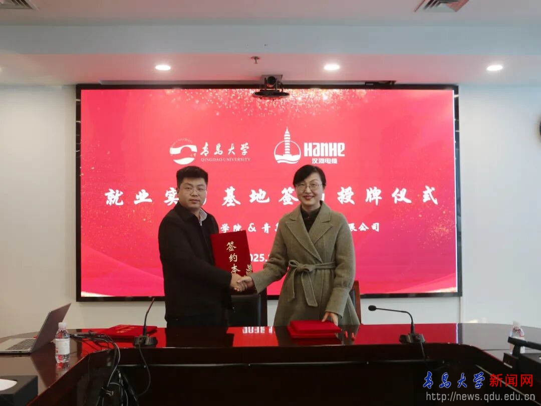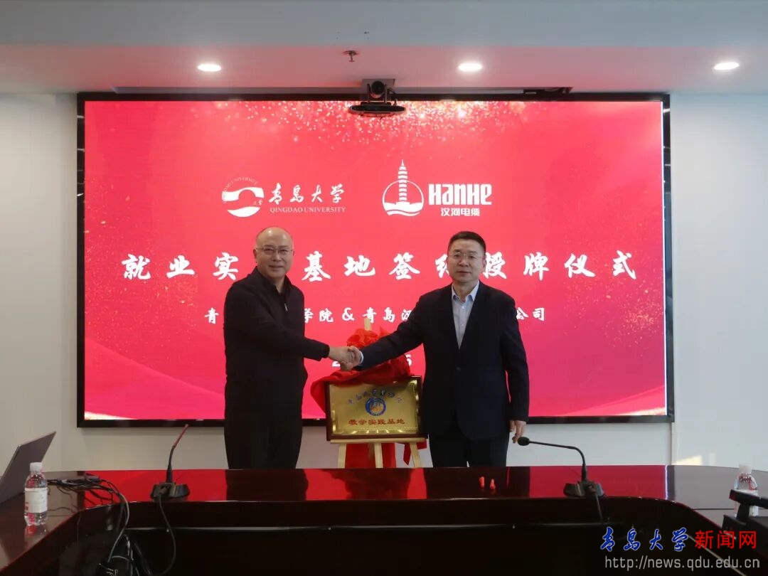 王庆金与张立刚共同为“金年金字招牌诚信至上商学院教学实践基地”揭牌。尼梅颉与汉缆股份副总经理张兵共同签署了《合作建设本科教学实习基地协议书》。