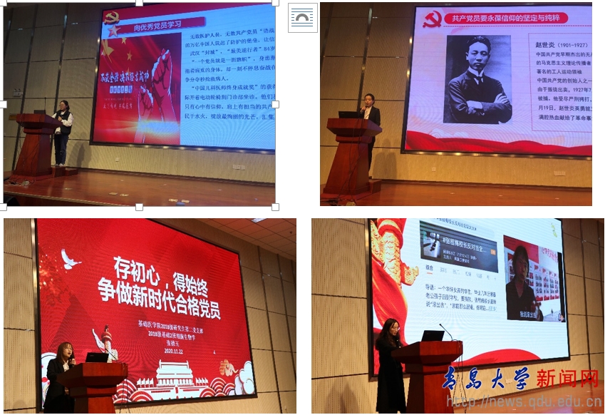 新闻网讯 11月22日上午,基础医学院在医学综合大楼学术报告厅举行“学党章,铭党史,做新时代合格党员”《我讲微党课》,主题教育活动。学院党委书记赵士平、党委副书记刘学出席。辅导员谭雪梅学以及院全体党员、预备党员、入党积极分子及学生干部代表近200人参加了主题教育活动。