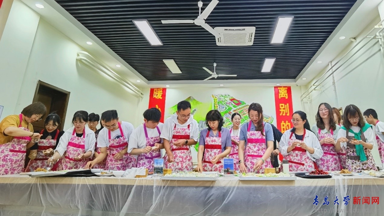 食堂大师傅现场教授了和面、包饺子窍门,为在场的老师和同学示范、指导。大家边听边做,互相交流切磋、展示,一时间各种形状、花色的水饺布满了仁园餐厅的案台。饺子煮熟后,刘校长带领老师们为现场的每一位同学盛上了一盘热腾腾的水饺,师生一起共飨美食,共赞“青大饺子”美味。经自己双手劳动做成的饺子,承载了同学们丰富的感情,大家纷纷表达了对学校的感谢、不舍和对未来的展望。