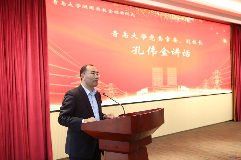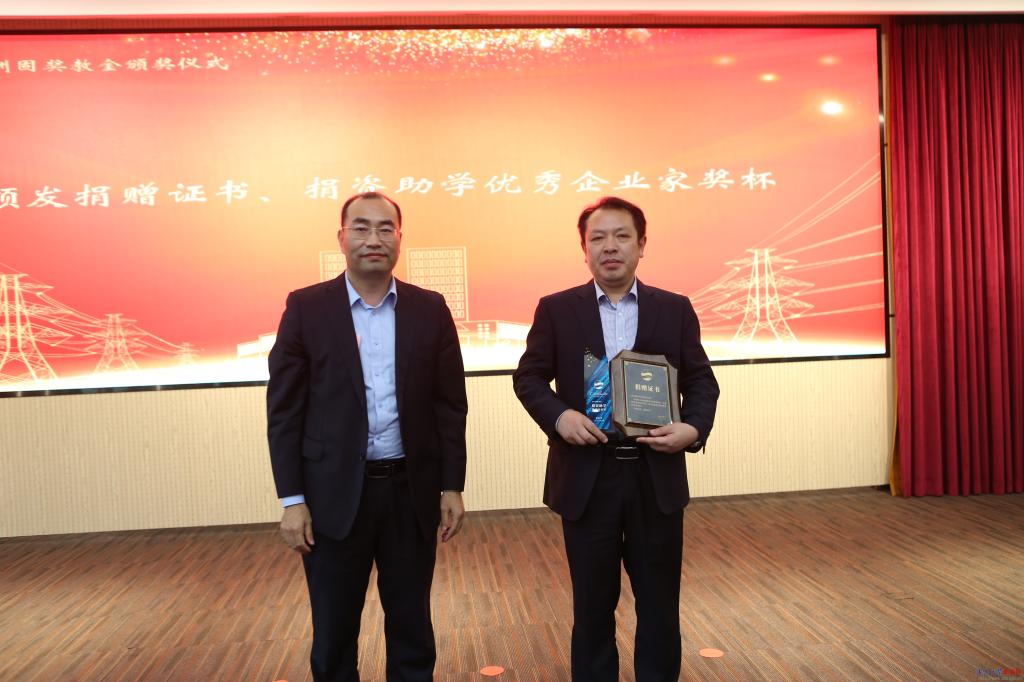 孔伟金代表学校给上海洲固电力科技有限公司颁发捐赠证书,向李勇颁授“捐资助学优秀企业家”奖牌。