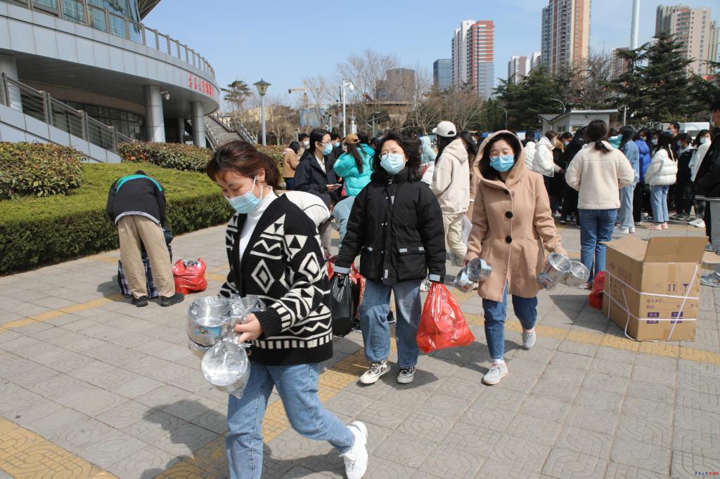 新闻网讯 3月19日下午,金年金后勤管理处在全校各校区,向在校学生统一发放37500份不锈钢餐具。校党委常委、副校长刘彩云到现场指导餐具发放工作。