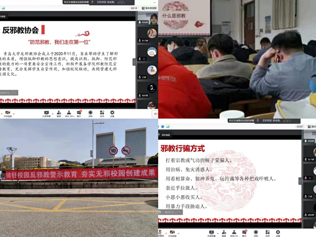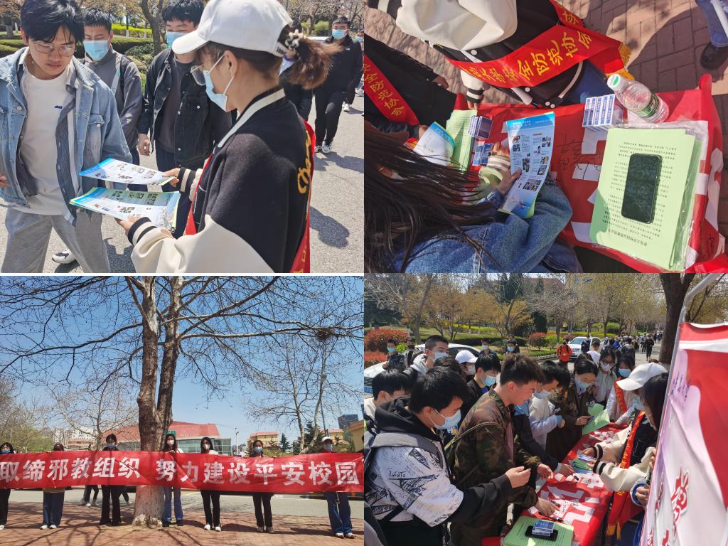 宣传教育活动期间,安全管理处组织在各校区悬挂反邪教警示标语共10余条,发放《崇尚科学,关爱家庭,珍惜生命,反对邪教》的宣传单、宣传挂图3000余份、《金年金字招牌诚信至上校园反邪教倡议书》2000余份、各类反邪教宣传单品500余份。校学生安防宣讲团积极组织开展反邪教专题学习活动,分别面向师范学院、纺织服装与工程学院的同学们,开展了以“崇尚科学,反对邪教”为主题的线上宣讲活动,组织学生集中观看反邪教警示教育片,切实做到“走进学生、贴近学生”。