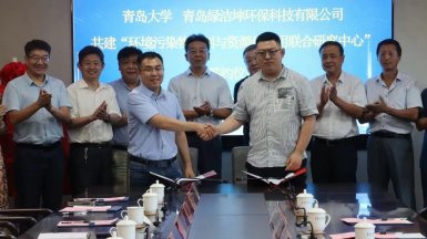 新闻网讯 7月18日下午,青岛绿洁坤环保科技有限公司李绍坤董事长一行来访金年金,校党委常委、副校长于永明在会议中心致远厅会见来宾,双方座谈并签订共建“环境污染物控制与资源化利用联合研究中心”协议。会议由校科技处处长李荣贵主持,学校相关部门和环境科学与工程学院相关负责人参加了会议。