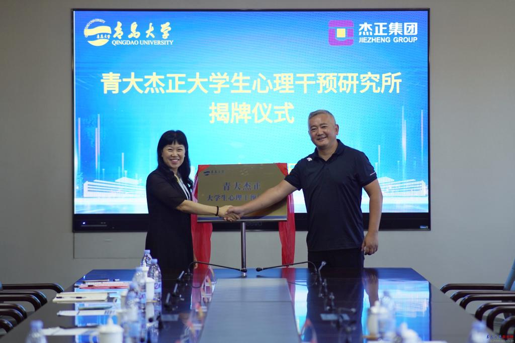 会上,学生处处长解涛和杰正投资集团有限公司总裁助理杨咏梅代表校企双方签署了《青大杰正大学生心理干预研究所执行协议》。刘彩云和方海晖共同为“青大杰正大学生心理干预研究所”揭牌。