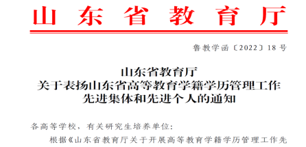 为深入学习贯彻党的十九大和十九届历次全会精神,激励工作、树立典型,2022年春季学期,山东省教育厅开展了山东省高等教育学籍学历管理工作先进集体和先进个人评选工作。全省高等学校(含成人高校)、普通本专科(高职)教育、研究生教育、成人教育、网络教育学籍学历管理工作部门与相关工作人员参与了评选。