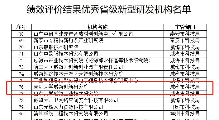 新闻网讯 近日,山东省科技厅公示2022年度省级新型研发机构绩效评价结果,金年金威海创新研究院再次荣获省级新型研发机构绩效评价“优秀”等次。本次考评,全省共有89家省级新型研发机构绩效评价结果优秀,其中,威海全市占9家。