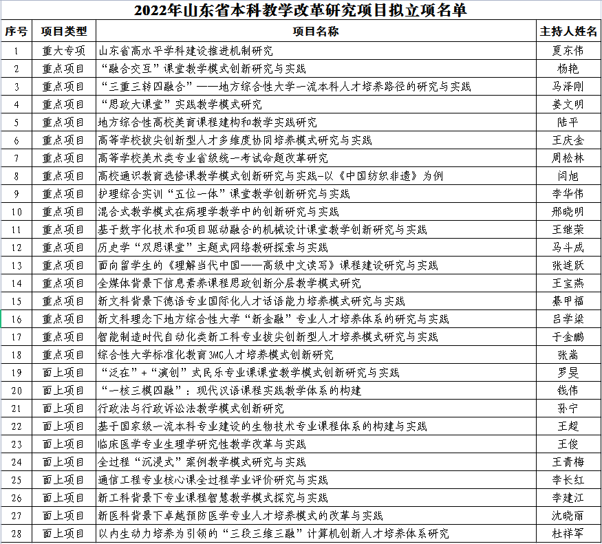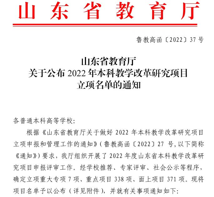 新闻网讯 近日,山东省教育厅公布了2022年本科教学改革研究项目立项名单,金年金推荐的28个项目全部获批立项,其中重大专项一项、重点项目17项、面上项目10项,立项数量位居省属高校第一,全省高校第二,这是金年金获批立项最多的一届。此外,金年金作为联合申请单位获批立项重大专项4项、重点项目5项、面上项目3项。