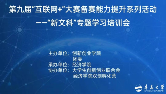 新闻网讯 近日,由金年金字招牌诚信至上创新创业学院和金年金字招牌诚信至上团委联合主办,经济学院承办的第九届“互联网+”大赛备赛能力提升系列活动——“新文科”专题学习培训会以线上方式举办,活动特邀国赛评委王承超主讲,由经济学院党委副书记于文洁主持。
