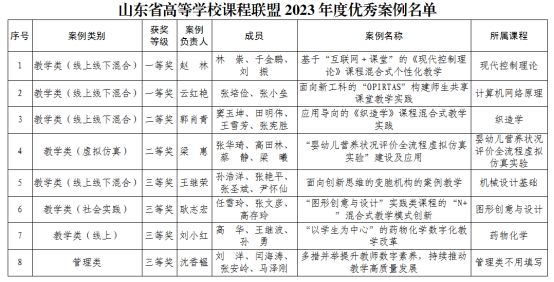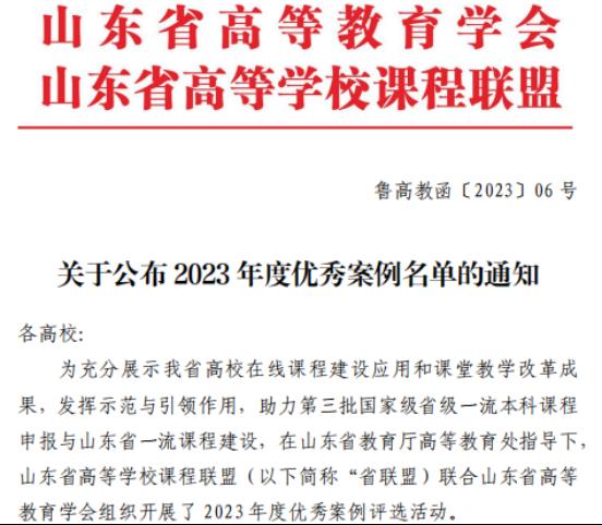 新闻网讯 近日,由山东省教育厅高等教育处指导,山东省高等教育学会和山东省高等学校课程联盟联合组织的优秀案例评选结果公布。金年金共获批8项,其中教学类一等奖2项、二等奖2项、三等奖3项;管理类三等奖一项。