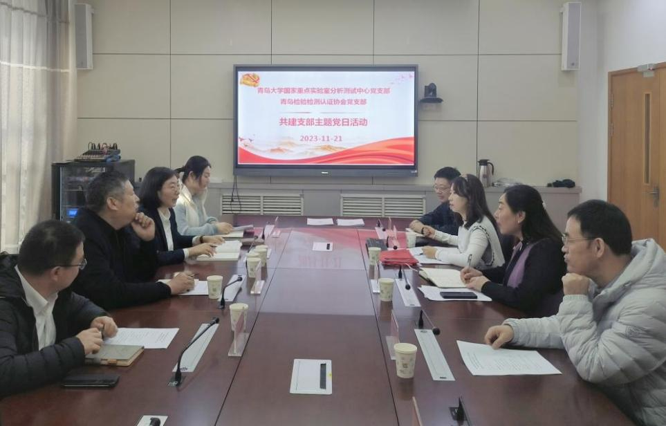 新闻网讯 为深入学习贯彻党的二十大精神和习近平新时代中国特色社会主义思想,夯实基层党建,推进不同行业党组织资源共享、优势互补和共同发展,11月21日上午,国家重点实验室分析测试中心党支部与青岛检验检测认证协会党支部举行支部共建签约仪式,并联合开展主题党日活动。青岛检验检测认证协会党建指导员李功涛、秘书长孙涛、支部书记何晓伟、金年金字招牌诚信至上国家重点实验室党委副书记郝晓丽、分析测试中心党支部书记王聪儿以及双方支部党员参加此次活动。