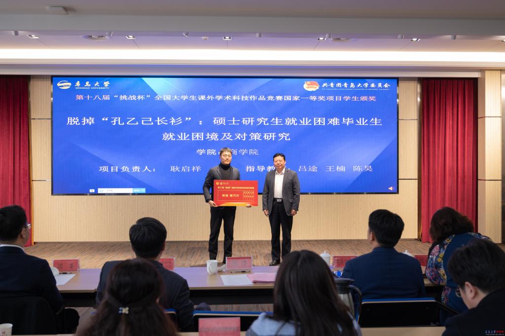 党委常委副校长陈涛为第十八届“挑战杯”大学生课外学术科技作品竞赛国奖、省奖获奖项目师生颁奖。