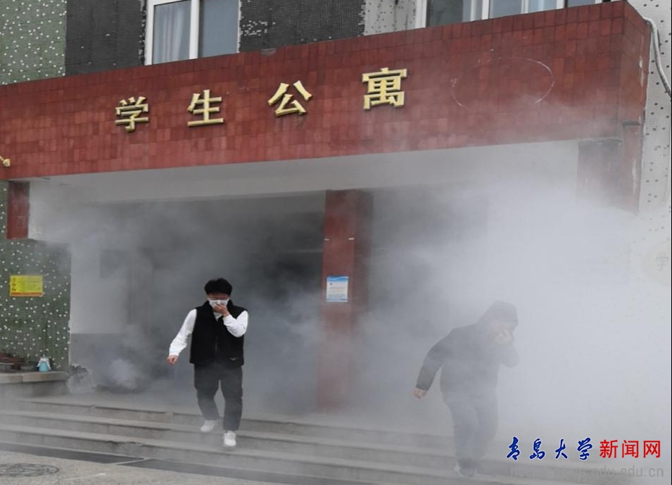 在疏散逃生演练环节,随着警报声响起,逃生现场浓烟滚滚,同学们用湿毛巾捂住口鼻,弯腰俯身,按照疏散线路从安全出口有序、迅速撤离至指定地点。