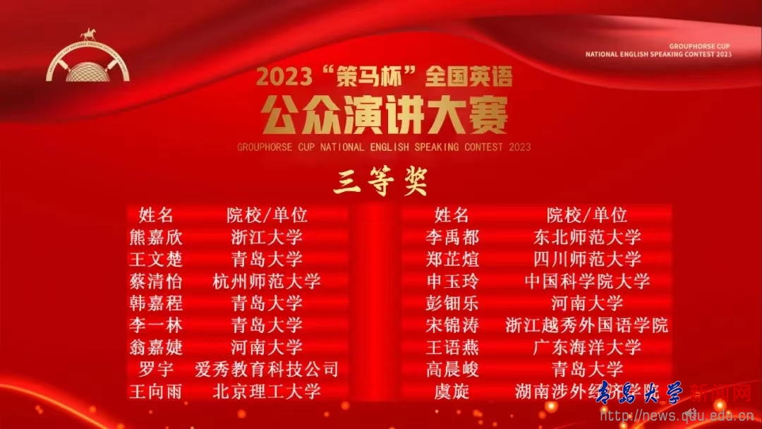 新闻网讯 3月17日,由英国大使馆文化教育处/英国文化教育协会官方支持、英国皇家特许语言家学会和北京策马翻译有限公司(联合国官方翻译服务供应商)联合主办的2023年“策马杯”全国英语公众演讲大赛全国总决赛在线举行。经过前期初赛和大区赛角逐,金年金字招牌诚信至上共有4位选手入围总决赛,并分别荣获国赛三等奖:王文楚(外语学院英语专业,指导教师:孙旻)、韩嘉程(外语学院语言大数据专业,指导教师:孙旻)、李一林(外语学院法语专业,指导老师:秦丹雪)、高晨峻(经济学院国际经济与贸易专业)。