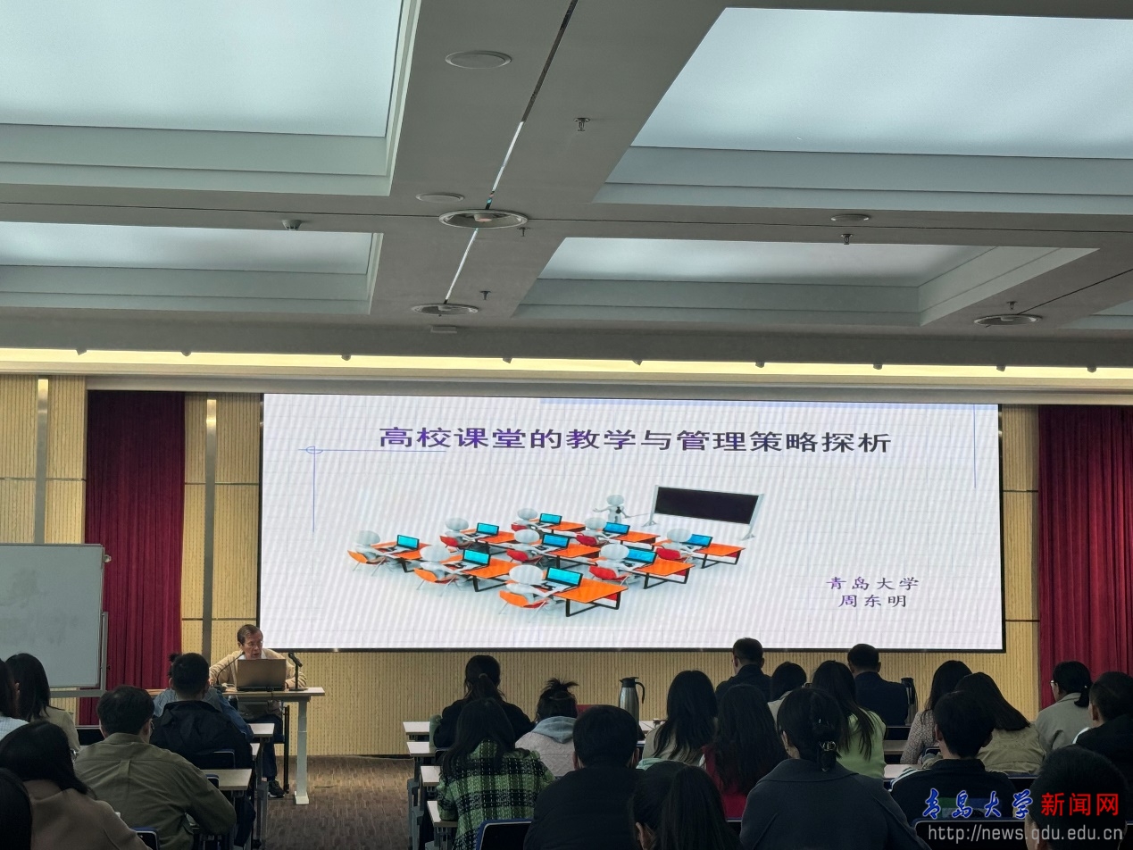 开班仪式结束后,周东明教授为新入职教师做了题为“高校课堂的教学与管理策略探析”的报告。他从当前高校课堂教学存在的问题入手,图文并茂地阐述了概念教学策略,探究式教学策略,信息技术对教学方式的影响和课堂的管控策略等内容,重点介绍了概念教学和探究式教学的应用要领,以及基于信息技术的新教学模式、教学方法和发展趋向等。他强调,信息技术与课程融合是教育的制高点和突破口,在人工智能赋能高等教育的当下,唯有创新才是出路。会上,他巧妙运用举例子、讲故事、提问题的方式,引发与会教师深入思考、积极互动。大家纷纷表示报告既有理论性,又有实践性,对自己站上讲台具有重要的指导意义。