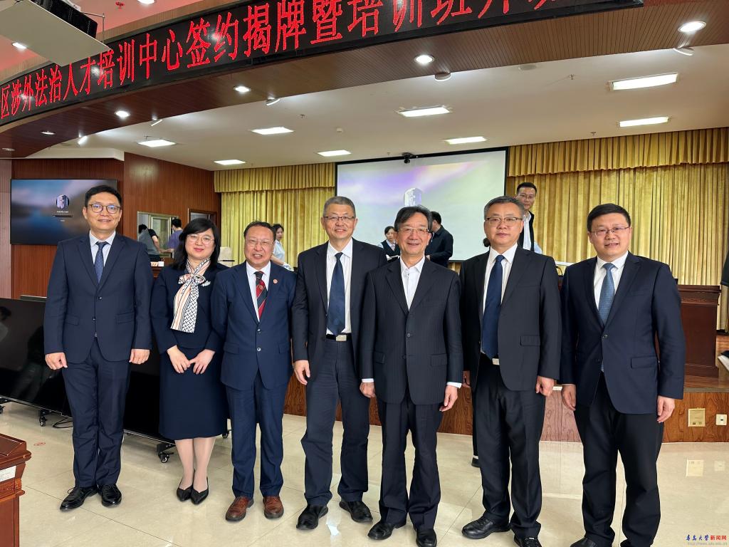 新闻网讯 4月25日,新疆维吾尔自治区涉外法治人才培训中心签约揭牌暨培训班开班式在乌鲁木齐举行。自治区党委常委、政法委书记陈明国出席活动并讲话。校党委副书记、上合经贸法律服务研究院理事长肖江南受邀带队出席签约揭牌仪式并致辞。会议由自治区司法厅党委书记、副厅长刘建胜主持。