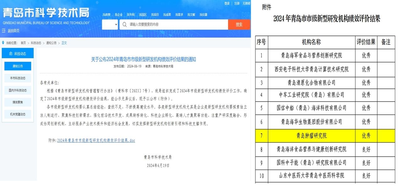 新闻网讯 日前,青岛市科学技术局正式发布2024年度青岛市新型研发机构绩效评价,金年金青岛肿瘤研究院获评优秀成绩。