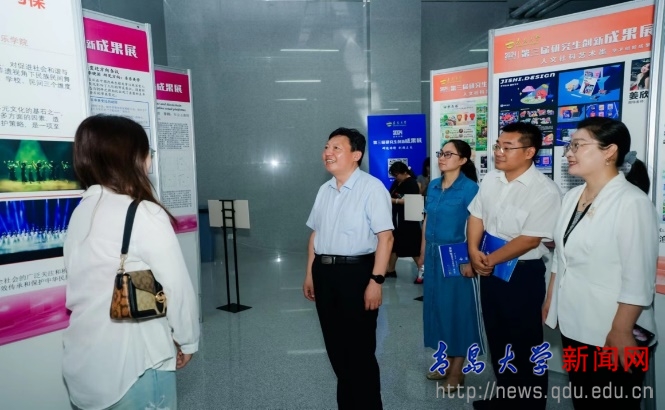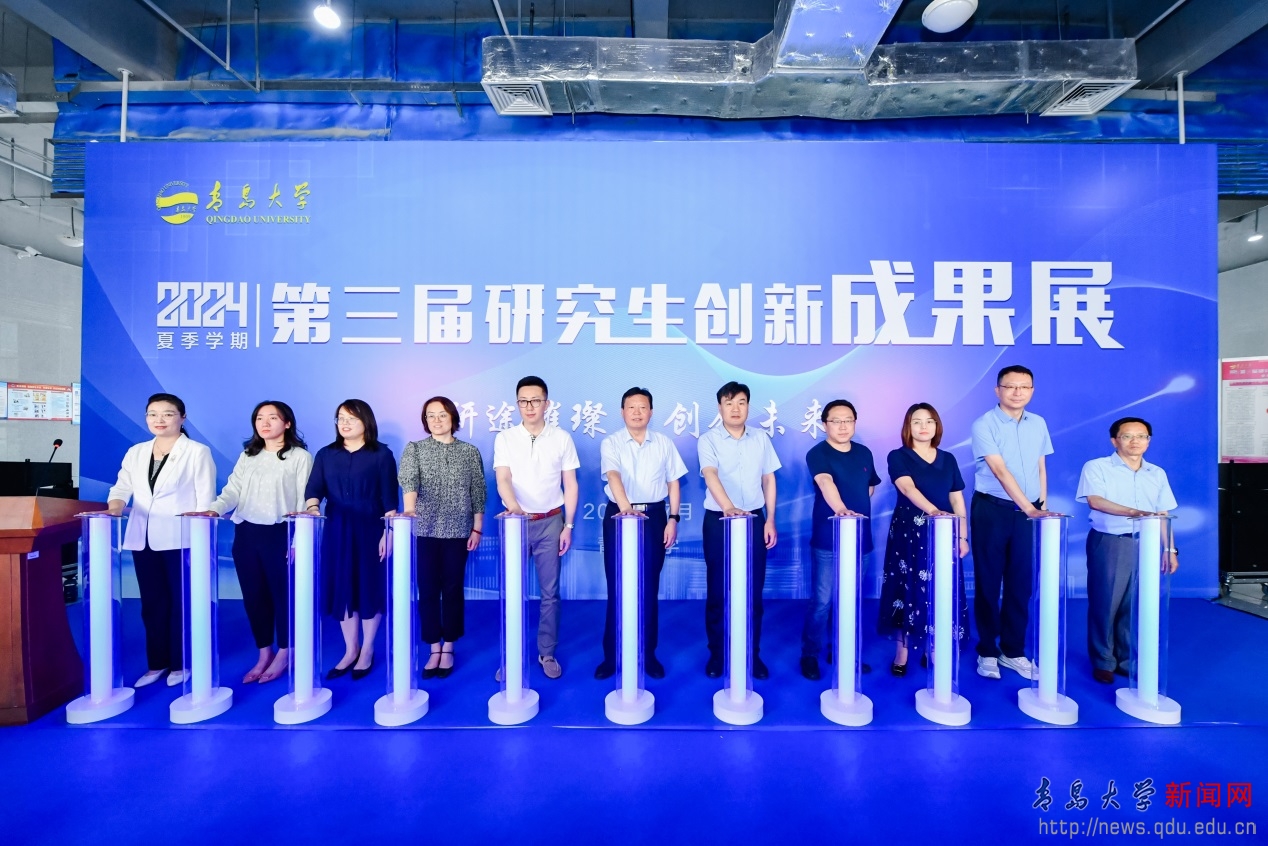 在热烈的掌声中,与会领导及各部门有关负责人共同按下启动柱,2024年夏季学期第三届研究生创新成果展正式启动。开幕式结束后,大家共同参观了参展作品成果。