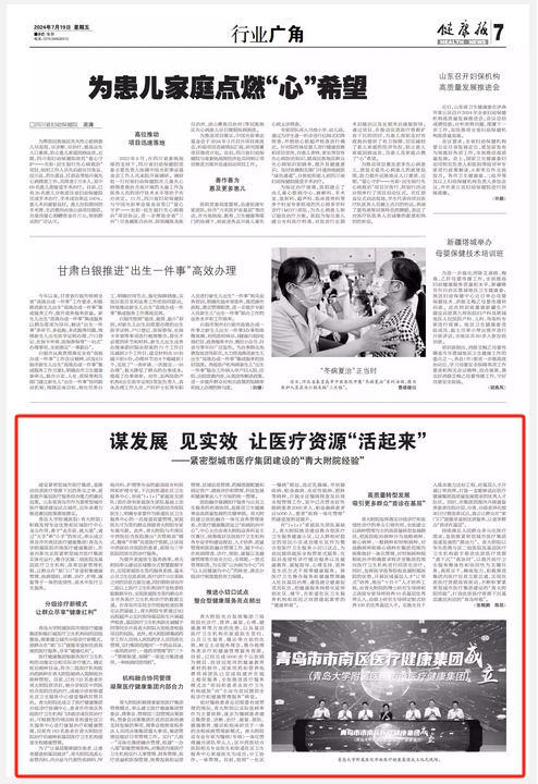新闻网讯 7月19日,《健康报》刊登题为《谋发展 见实效 让医疗资源“活起来”--紧密型城市医疗集团建设的“青大附院经验”》的文章。