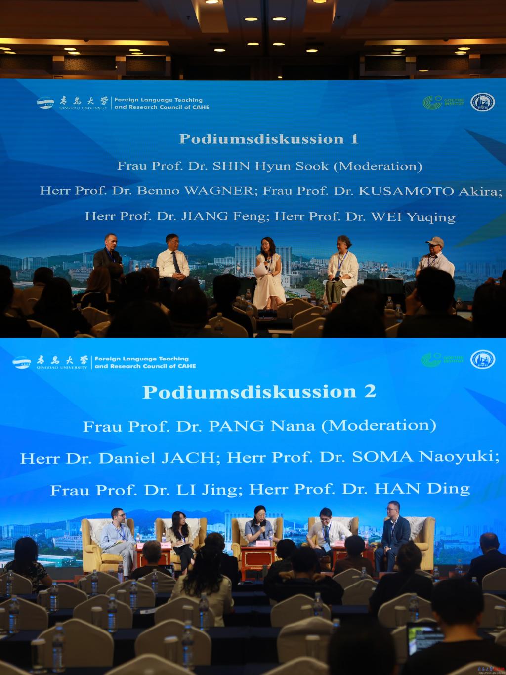 26日下午和28日上午,大会以“日耳曼学的时代挑战与机遇”为主题,举行了专家圆桌论坛和青年学者圆桌论坛。韩国首尔女子大学申贤淑教授主持专家圆桌论坛,日本德语教师联合会会长、丽泽大学草本晶教授,德国锡根大学本诺·瓦格纳教授,国务院学科评议组召集人、上海外国语大学原书记姜锋教授,复旦大学魏育青教授参加专家圆桌论坛;山东大学庞娜娜副教授主持青年学者圆桌论坛,西南交通大学德国学术交流中心专家达尼尔·亚赫、北京外国语大学李婧副教授、日本筑波大学助理教授相马尚之、对外经贸大学韩丁副教授参与讨论。各位学者从多个维度剖析日耳曼学在当今时代背景下所面临的挑战和机遇,就不同国家日耳曼学教学与研究的现状与问题进行了深度交流,为日耳曼学的发展与变革出谋划策,深富启发性。