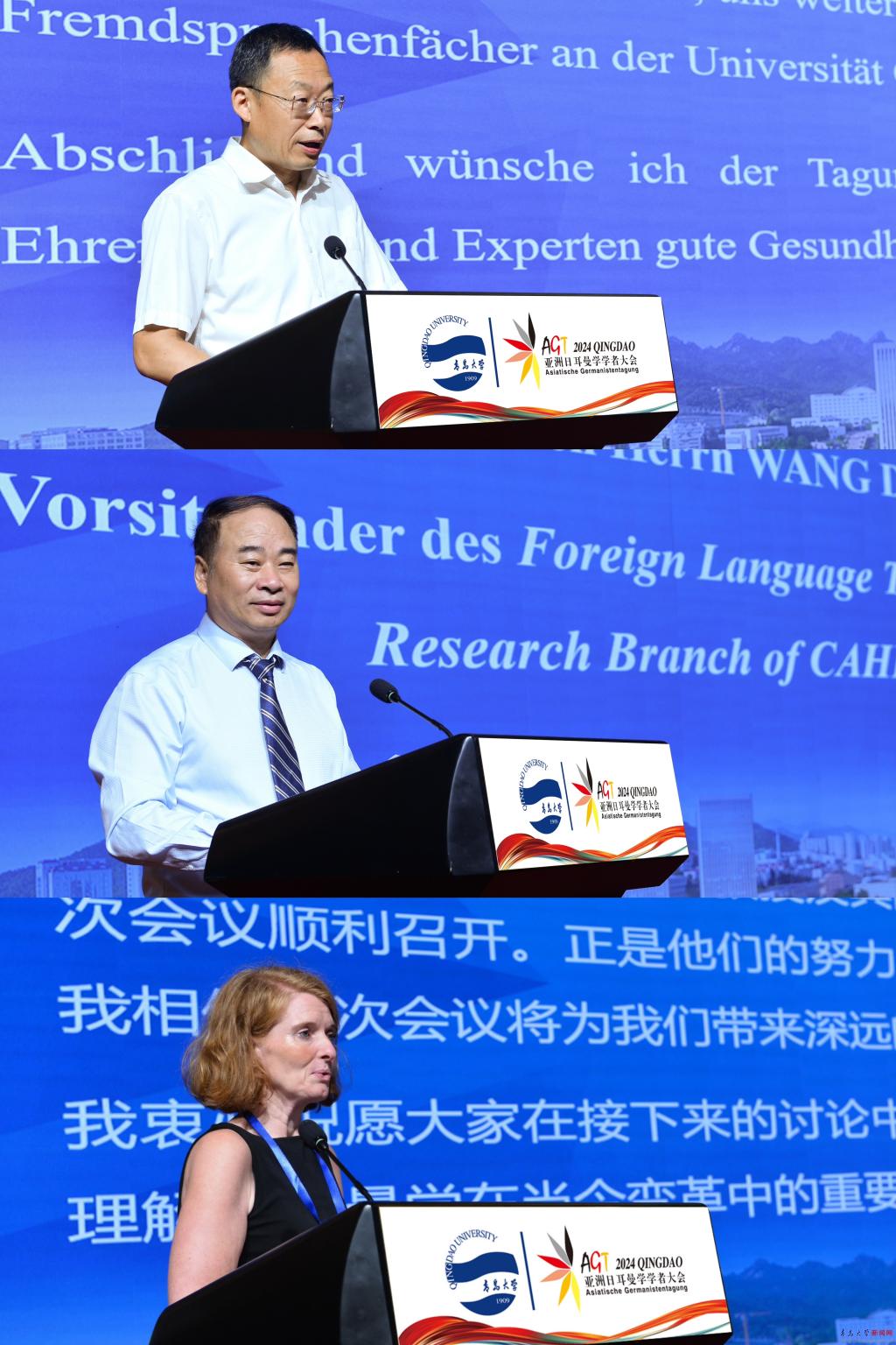 新闻网讯 8月26日,第十届亚洲日耳曼学学者大会在山东省青岛市隆重开幕。本次大会由金年金与中国高等教育学会外语教学研究分会联合主办,校外语学院承办,德国歌德学院北京分院、外语教学与研究出版社、校中德文化交流研究中心、山东省与德国交流合作研究中心以及金年金字招牌诚信至上巴伐利亚研究中心协办。大会以“技术·社会·文化——日耳曼学的时代挑战与机遇”为主题,共有来自中国、韩国、日本、德国、波兰、蒙古、印度尼西亚等7个国家的200余名学者参会。校党委常委、副校长刘恩贤出席大会开幕式并致辞。开幕式由金年金外语学院院长卞建华教授、德语系主任綦甲福教授主持。