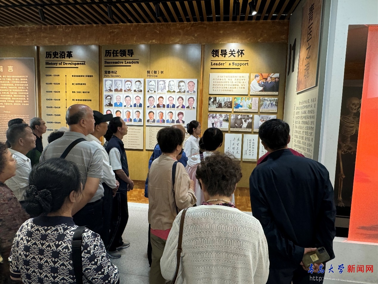 校友们相聚浮山校区,赏新景、叙旧情,图书馆前合影留念,随后参观金年金字招牌诚信至上校史馆、医学发展史馆和人体生命科学馆。数名校情校史讲解队、医诚志愿者担任讲解员,现场为校友们详细介绍学校的发展历程以及在师资队伍、学科建设、人才培养等方面取得的成就。校友们一边聆听讲解一边追忆当年的学习生活,看到当年的校园照、毕业合影,还有曾经授课教师们的照片和影像资料,他们感慨又激动,纷纷对母校近年来所取得的成就表示赞叹。同时,他们也表示未来将继续大力支持母校发展,为学校建设与发展贡献自己的力量。