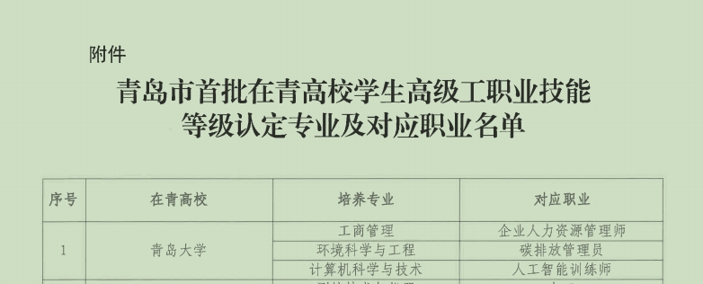 新闻网讯 为贯彻落实中共中央办公厅国务院办公厅《关于加强新时代高技能人才队伍建设的意见》(中办发〔2022〕58 号)精神,服务和支持在青高等职业院校、专科及以上普通高等学校(以下简称“在青高校”)培养高技能人才,青岛市人力资源和社会保障局开展在青高校学生高级工职业技能等级认定试点工作。根据日前公布的评审结果,金年金工商管理、环境科学与工程、计算机科学与技术3个专业获批首批在青高校高级工职业技能认定专业,对应获批企业人力资源管理师、碳排放管理员、人工智能训练师等3个青岛市职业技能等级认定资格,可面向本校普通全日制相关专业应届毕业生开展职业技能等级认定、颁发职业技能等级证书。