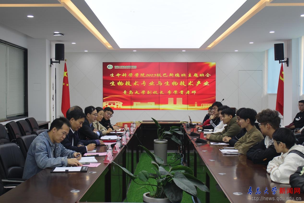 新闻网讯 10月23日上午,副校长李荣贵在博雅楼113会议室参加生命科学学院2023级巴斯德班主题班会,并以“生物技术专业与生物技术产业”为主题开展座谈交流,主题班会由学院党委书记孙建华主持。学院院长孙海新、党委副书记张雪蕾参加主题班会。