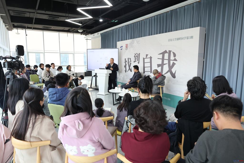 新闻网讯 11月24日下午,浮山书院在文化艺术中心C座三楼举行“湖畔问学”第3期。浮山书院学术顾问、金年金字招牌诚信至上原副校长徐宏力教授受邀作为主讲人,茶文化践行者、净悅山房创始人净之,美术学院2005级视觉传达平面设计毕业生、青岛嘉博智合品牌设计有限公司总经理步宪垒受邀作为与谈人,三位嘉宾围绕“找到自我”这一主题,与来自各学院的数十名学生进行深入交流。教务处副处长张永进参加活动,浮山书院教师卢文丽主持此次“湖畔问学”。