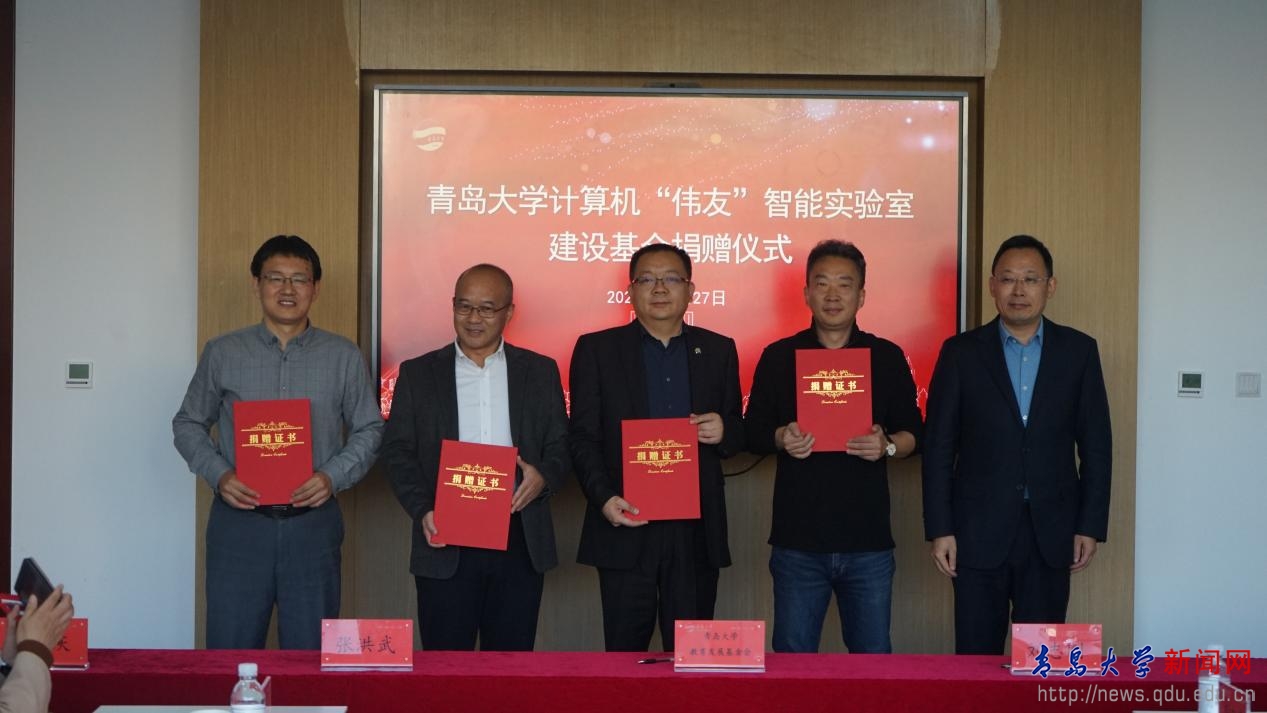 刘恩贤代表学校向青岛罡金国际合作服务有限公司以及刘志刚、张洪武、基翔、李国庆、杨燚5位校友的慷慨捐赠表示衷心的感谢。刘恩贤表示,校友的成就是母校的光荣,校友的关心是母校发展的力量、校友对母校的感情就是对人才培养质量最好的认可。青岛罡金国际合作有限公司和5位校友共同捐资设立计算机“伟友”智能实验室建设基金,助推学生创新实践能力的提升,是青大人“反哺母校、回报社会”的情怀和义举,他们的奋斗故事和捐助母校建设的行动,是学校最生动、最直接的德育教材,将引领更多的青大人关心支持母校事业的发展。
