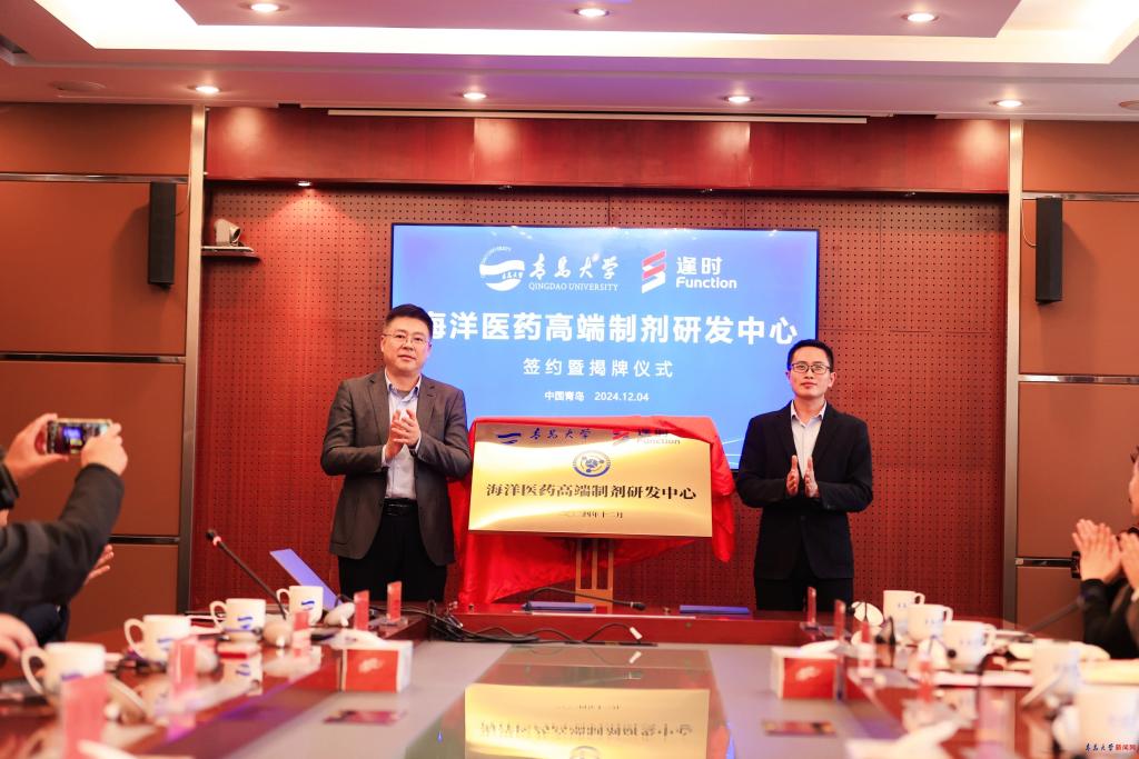 活动现场,牛海涛、刘晶代表双方签署“共建金年金字招牌诚信至上逢时科技海洋医药高端制剂研发中心”合作协议,药学院院长孙勇、逢时科技医药研发总监邓学鹏共同为“金年金字招牌诚信至上—逢时科技海洋医药高端制剂研发中心”揭牌。