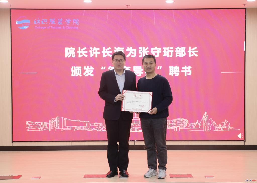 会上,纺织服装学院院长许长海为张守珩颁发“德育导师”聘书。