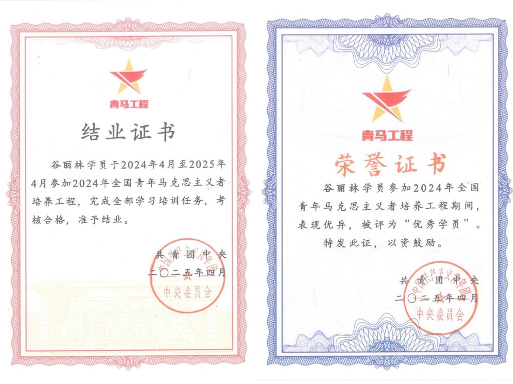 新闻网讯 近日,由共青团中央主办的青年马克思主义者培养工程全国班2024年度结业式在中央团校举行,2024年全国“青马工程”高校班学员、学校文学与新闻传播学院2024级比较文学与世界文学专业硕士研究生谷丽林参加活动并被评为全国“青马工程”优秀学员。