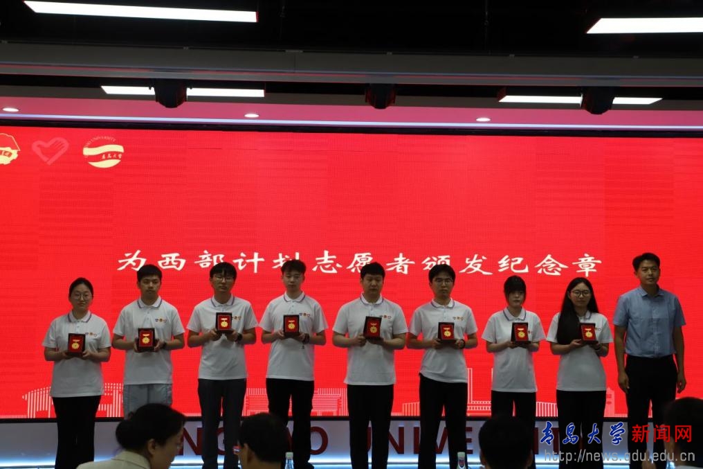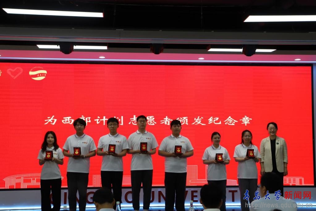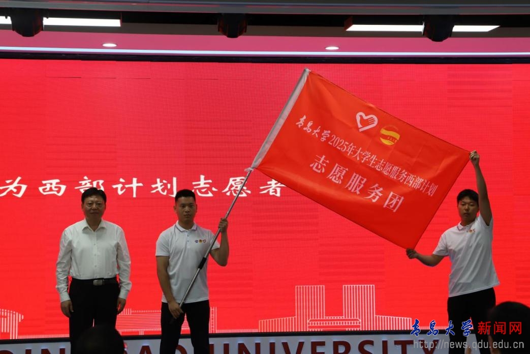 陈涛向志愿者团队授旗,与会领导为西部计划志愿者颁发纪念章,校团委志工部部长宣读2025年西部计划志愿者派出情况,西部计划志愿者、体育学院2021级毕业生张真代表志愿者发言。