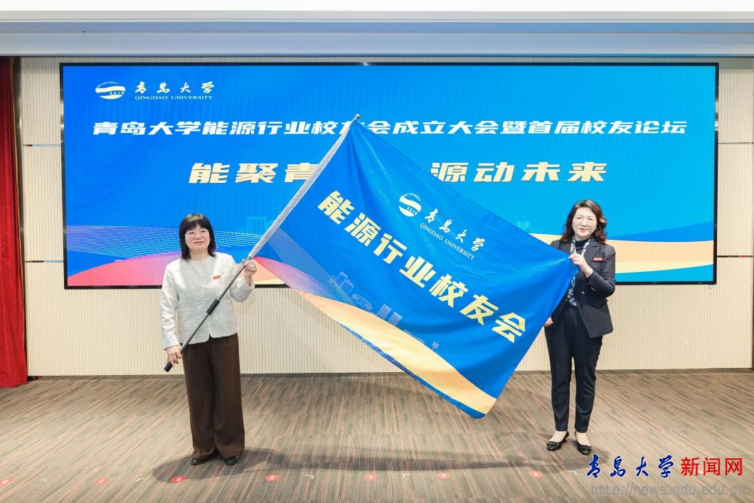 王海荣为能源行业校友会授旗,秘书长王文彦接旗。