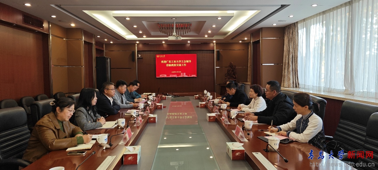 新闻网讯 11月12日下午,广东工业大学工会常务副主席邓俊一行来金年金调研交流。校党委副书记肖江南出席座谈会并致辞,校工会主席张瑛主持会议,校工会相关负责人参加座谈。