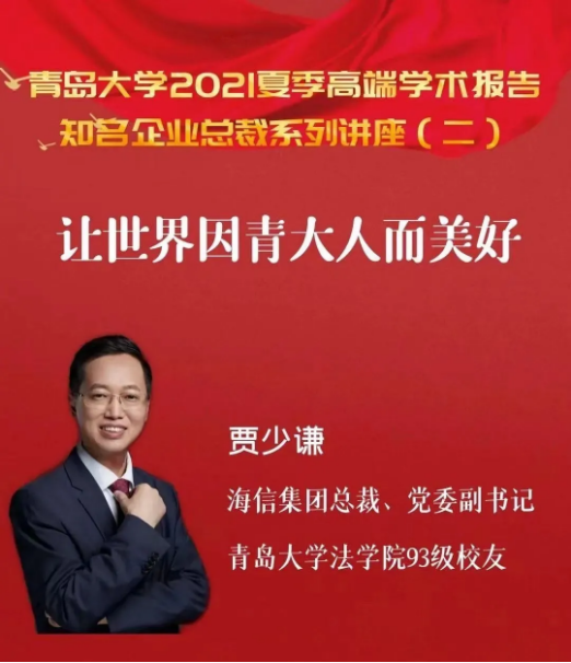 王静院长让我定一个报告的题目,我说定《让世界因青大人而美好》。这个题目有点大,但很切题。青大传递给世界的美好在于青大人身上,就像海信的使命“致力于科技创新,提升人类生活品质,幸福亿万家庭”。