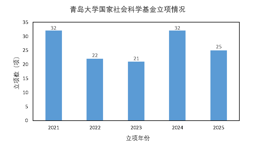 “十四五”期间,学校国家级项目立项数量和立项质量显著提升。2021年以来,共获批国家社科基金项目132项,含重大项目4项,国家社科基金年度项目、后期资助项目、中华学术外译项目等其他国家级项目128项。其中,2021年获批国家社科基金项目32项,立项数量创历史新高,艺术学单列项目立项数位列全国第五、山东省第一;2022年获批国家社科基金重大项目1项,实现了学校社会科学领域重大项目的突破,形成了人文、社科“两翼齐飞”的良好局面;2024年是学校国家级项目的丰收之年,再次获批国家社科基金项目32项,并首次获批国家社会科学基金哲学社会科学领军人才项目,首次获批“新时代海洋强国建设”重大项目研究专项,首次获批军事学重点项目,不仅在同一年度内获批了3项国家级重大项目,位列省属高校第一,也是学校国家社科基金立项类别最广、立项质量最高的一年,标志着学校在科研项目组织方面实现了量质双飞的新飞跃;2025年,获批国家社科基金后期资助项目6项,立项数量位列省属高校第二位。
