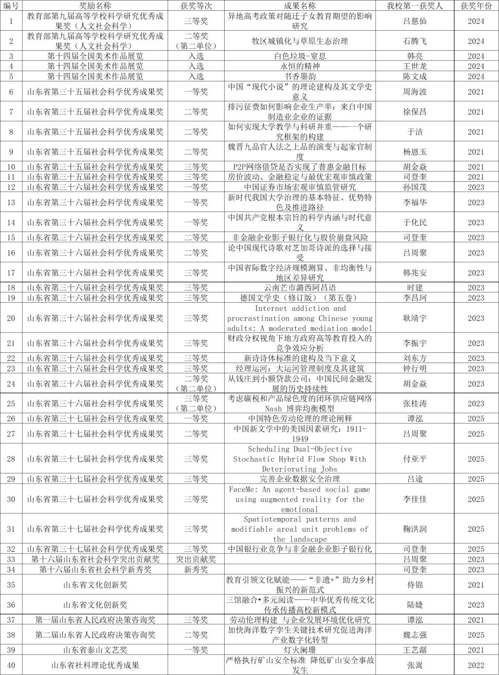 获批省部级及以上科研奖励40项,其中教育部高等学校科学研究优秀成果奖(人文社会科学)2项,全国美展入选3项,山东省社会科学优秀成果奖29项(含一等奖5项,突出贡献奖、新秀奖各1项),山东省文化创新奖2项,山东省政府决策咨询奖2项,山东省泰山文艺奖、山东省社科理论优秀成果奖各1项。