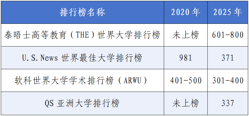 经过五年的建设,学校综合实力排名和国际声誉持续攀升,连续5年入围软科(ARWU)、U.S.News、泰晤士高等教育(THE)和QS亚洲大学世界四大主流排行榜;在2025软科世界大学学术排行榜中,位列全球301—400位、国内第55位;在2025-2026年度U.S.News世界最佳大学排行榜中,位列全球第371位、国内第51位;在2026泰晤士高等教育世界大学排行榜中,位列全球第601—800位、国内第45位;在2026QS亚洲大学排行榜中,位列亚洲第337位、国内第64位。学校ESI学术影响力排名升至全球第409位、国内第52位,全球排名提升626位,国内排名提升19位,继续位列全球影响力提升速度最快的高校之一。