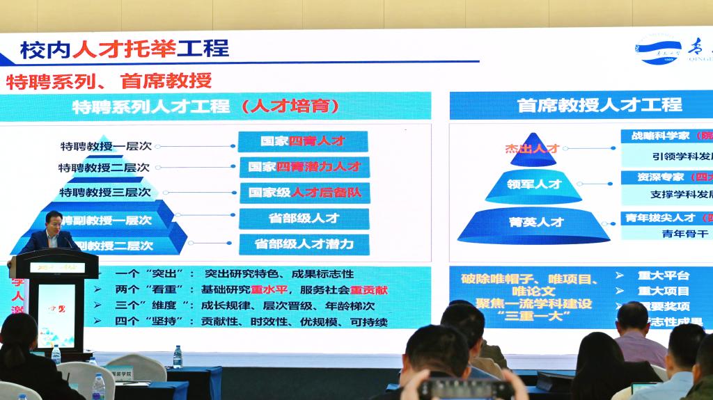 体制机制创新是激发人才活力的关键。学校以人才发展体制机制创新为主线,利用系统思维,以人才发展体制机制创新为突破口,构建起贯通“‘师资博士后’储才-‘青蓝’引才-‘特聘系列’育才-‘首席教授’引领”的全链条人才发展体系。注重发挥人才评价的“指挥棒”作用,采用“称量结合”方式,对人才全面进行画像,高层次人才重点考察学术影响力,中青年学术骨干人才重点考察教学科研实力,青年人才重点考察学术潜力,推动人才发展向学科属性、人才属性、激励属性聚焦融合,为贯彻“人才强校”战略提供制度保障。